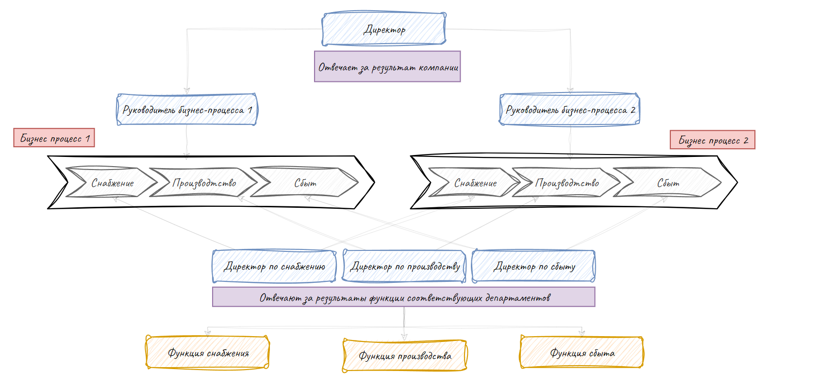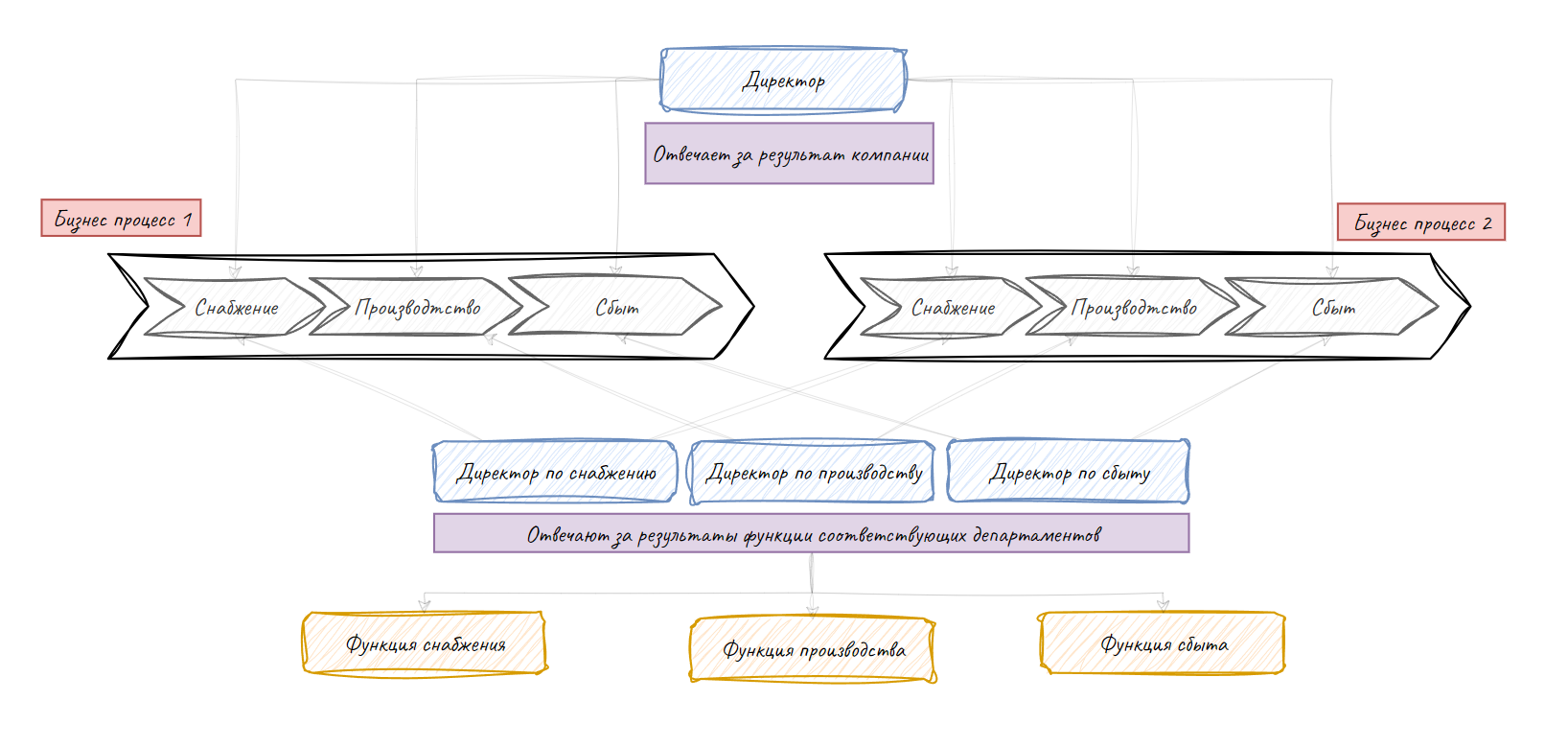 При функциональном подходе каждому этапу соответствует свой объем работ, но каждый функциональный отдел на практике имеет определенные допуски по нормативам. В результате последовательности операции, на каждом этапе может быть ничего не нарушено, но итоговый результат будет некорректен. И возникает абсурдная ситуация, в котором ответственным за результат становится крайний в цепочке, при этом он не является владельцем процесса и не может повлиять на общий результат.