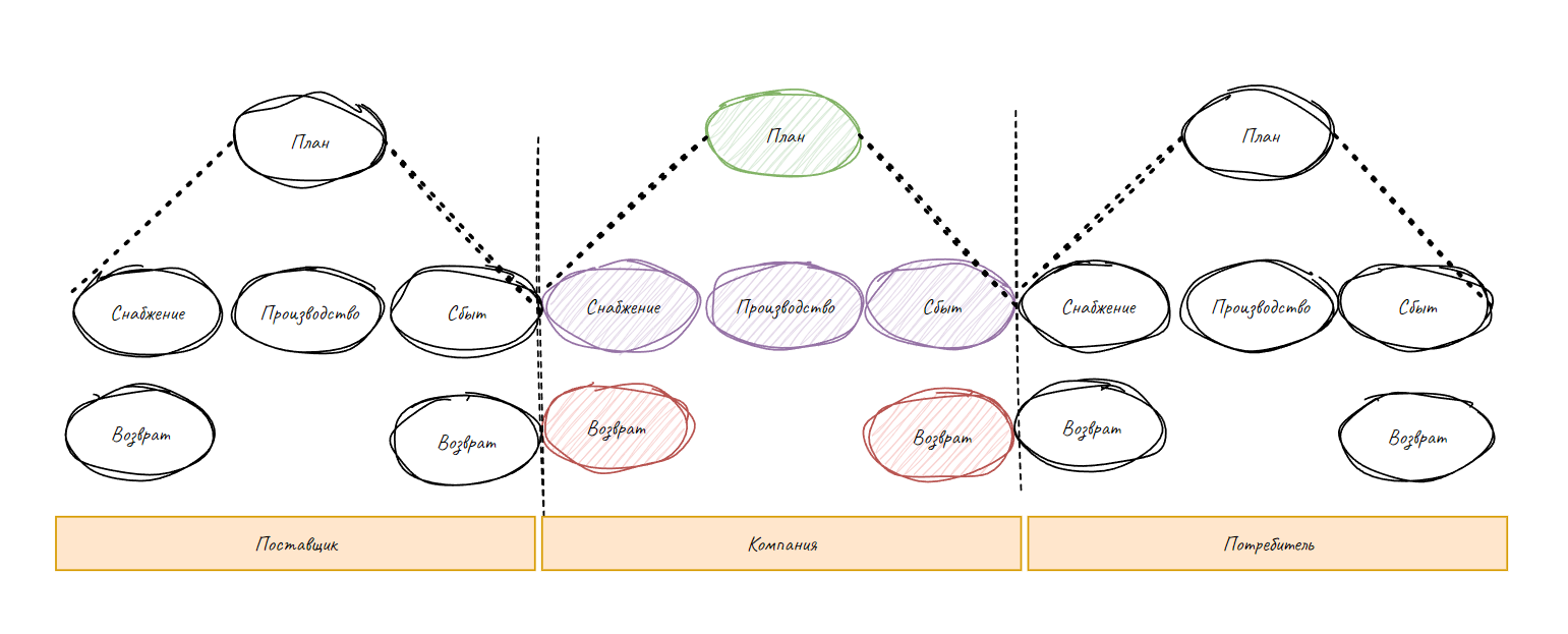 Ключевые процессы цепи поставок агрегируются в три макропроцесса: