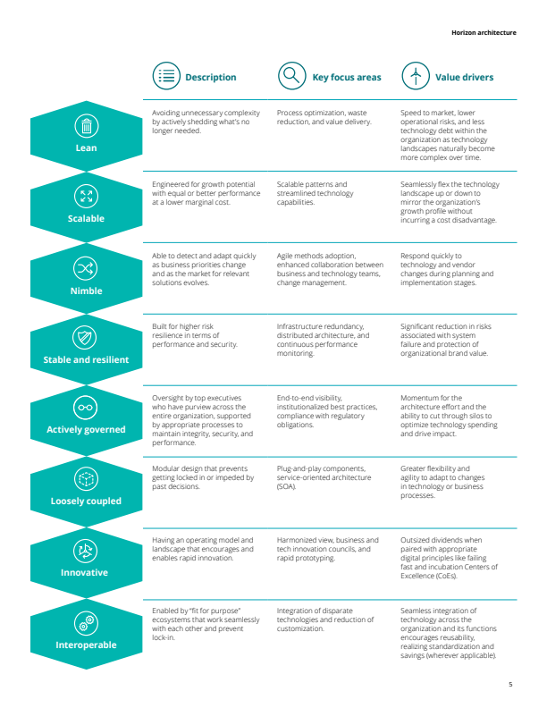 Восемь характеристик Horizon Architecture и их фокусные области и ценностные драйверы (источник: Deloitte).