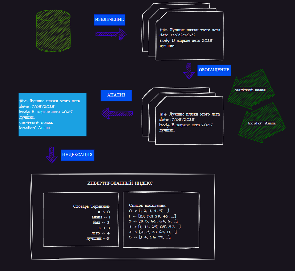 Сначала данные извлекаются из источника, в котором хранится информация. Это может быть база данных, текстовые файлы, веб-страницы или любой другой источник. Эти необработанные данные преобразуются в документы, описанные ранее. Документы могут быть дополнительно обогащены — в них добавляются новые поля с внешней информацией, которая помогает при сопоставлении или ранжировании.