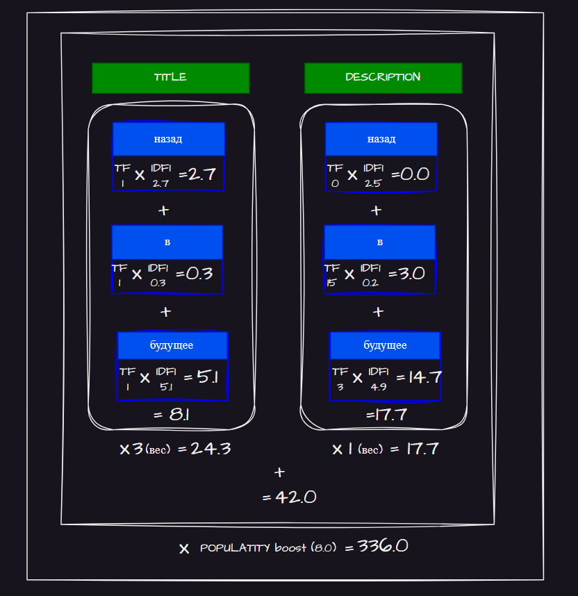 Так, в нашем примере с запросом “назад в будущее” любой документ, в котором в поле описания часто встречается слово “будущее”, получит более высокий балл за счёт частоты употребления этого слова и относительной редкости термина “будущее” в корпусе.