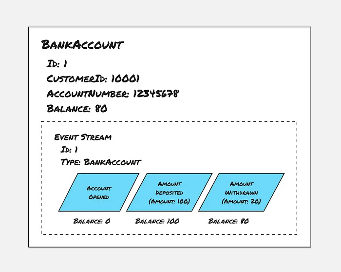 Event Sourcing предполагает хранение всех событий, произошедших с сущностью, в неизменяемом потоке событий (Event Stream).