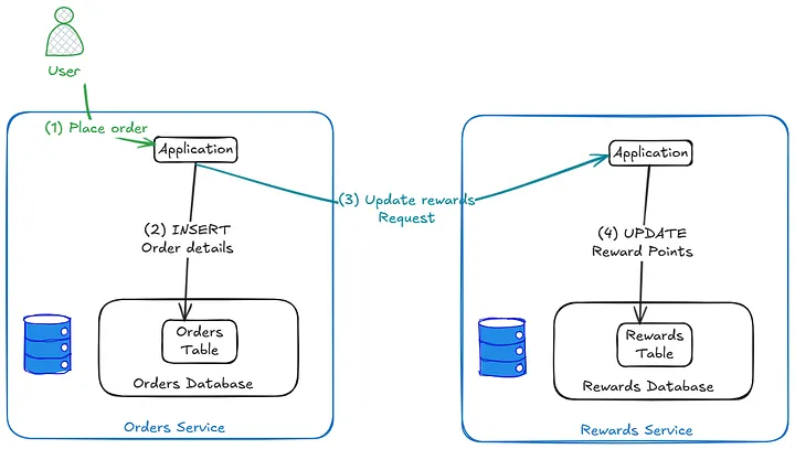 В монолитной архитектуре, как в данном примере, это просто. Начинается транзакция, обновляются необходимые таблицы, и транзакция фиксируется. Если что-то пойдет не так, все изменения откатываются. Но что происходит, когда разные сервисы обрабатывают историю заказов и вознаграждения?