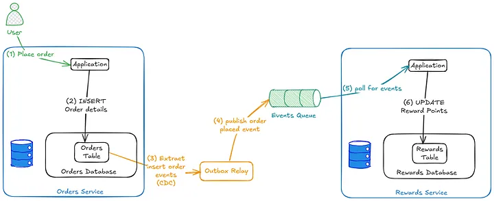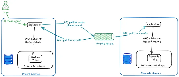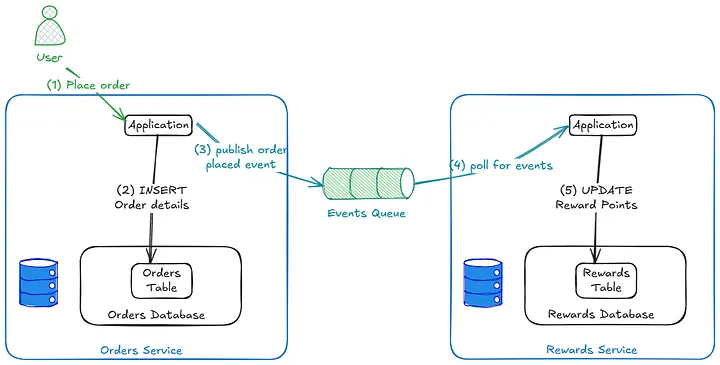 Архитектура, основанная на событиях (Вопросы для интервью Event Driven Architecture (EDA)), может гарантировать, что сервис вознаграждений обработает событие хотя бы один раз после того, как событие будет отправлено в очередь событий. После записи в таблицу заказов, сервис заказов отправляет событие в сервис вознаграждений, и тот может в конечном итоге обработать событие и обновить необходимые баллы в таблице вознаграждений.