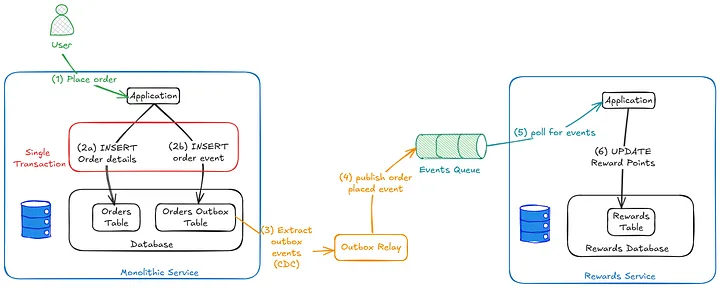 Если передача событий в сервис вознаграждений требуется только при изменении таблицы заказов, можно использовать Change Data Capture на таблице заказов вместе с фильтрами событий, вместо того, чтобы создавать отдельную таблицу выходных сообщений. Каждый раз, когда новый заказ добавляется в таблицу заказов, это изменение данных может быть захвачено и обработано как событие для сервиса вознаграждений.